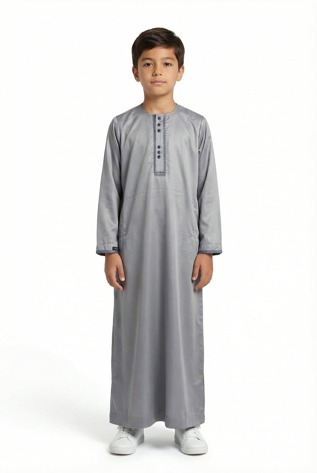 The Boys Omani Thobe 1528 in Grey is a refined and modern thobe designed for children who value comfort,