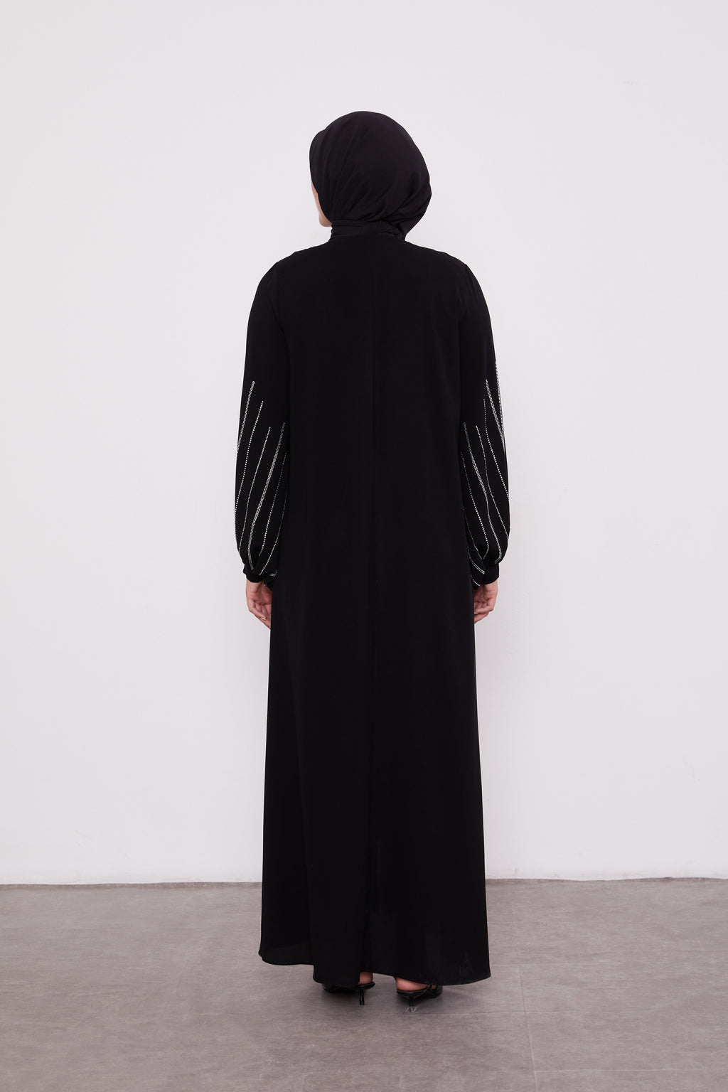 Classic Zipped Abaya with Cuffed Sequenced Sleeves Black 520628