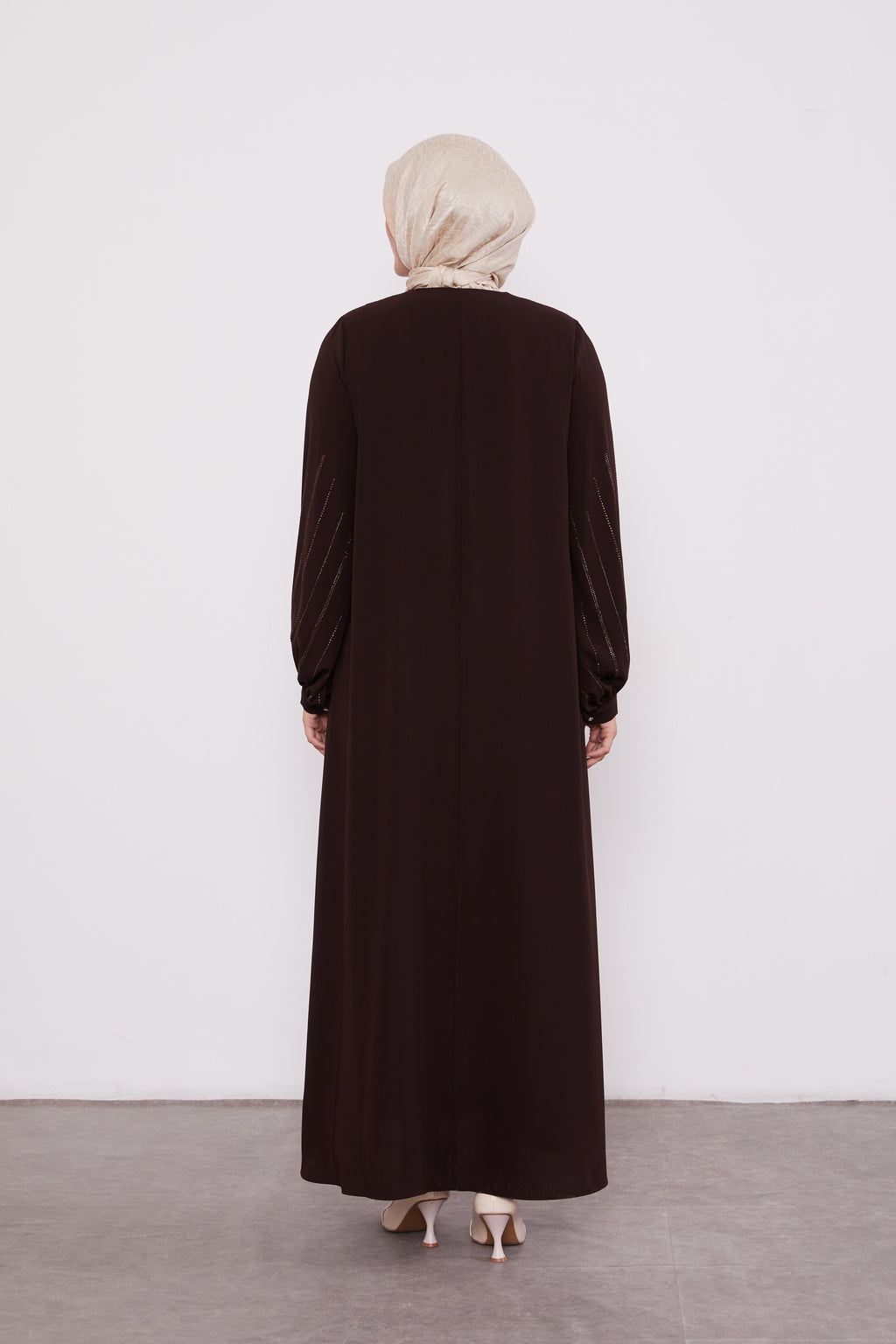 Classic Zipped Abaya with Cuffed Sequenced Sleeves Chocolate 520628
