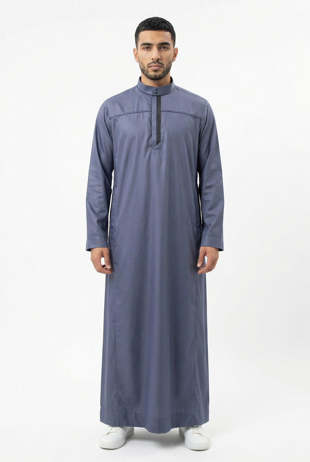 The Collared Thobe 1505 in Dark Grey is a refined modern thobe designed for men who appreciate clean lines