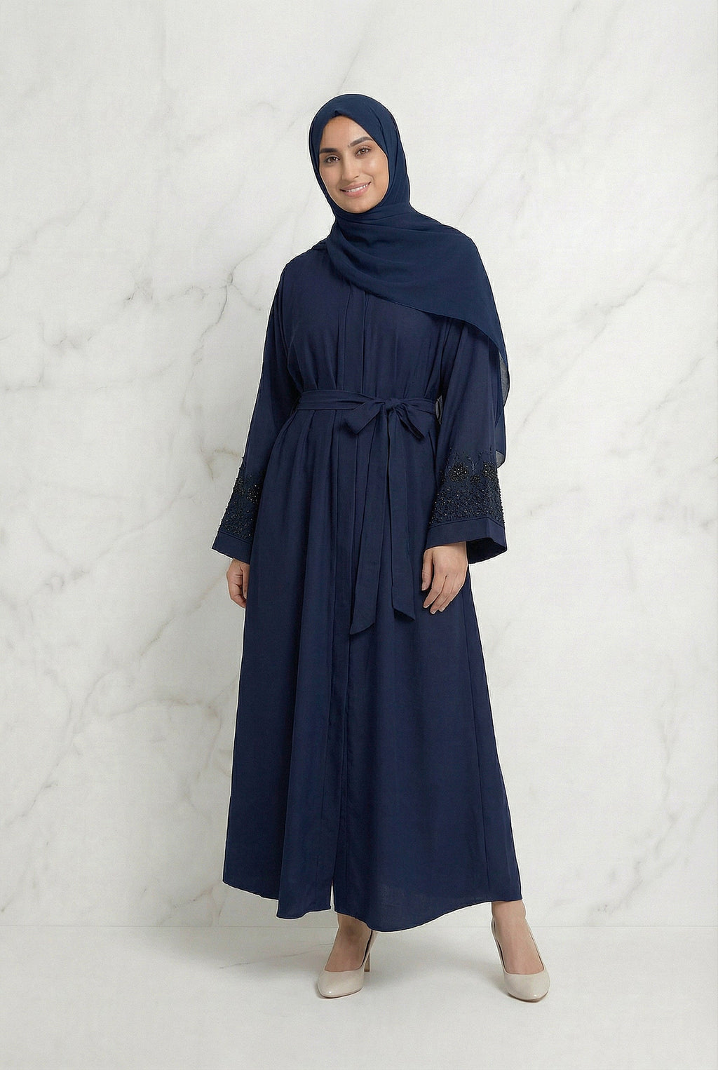 The Belted Abaya in Navy Blue is a graceful and refined design created for effortless modest styling.