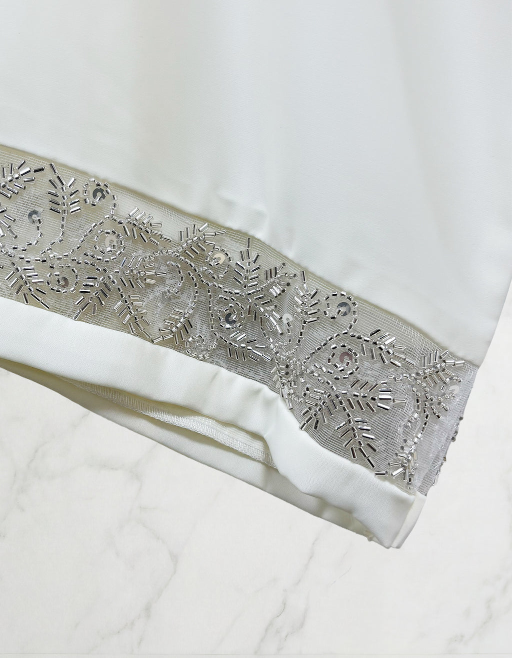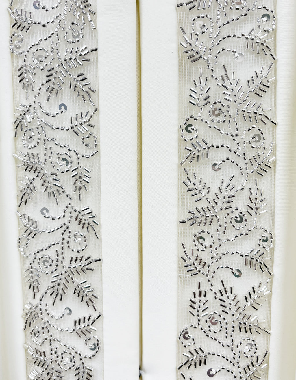 intricate silver embroidery along the front and sleeve cuffs adds a subtle touch of luxury.