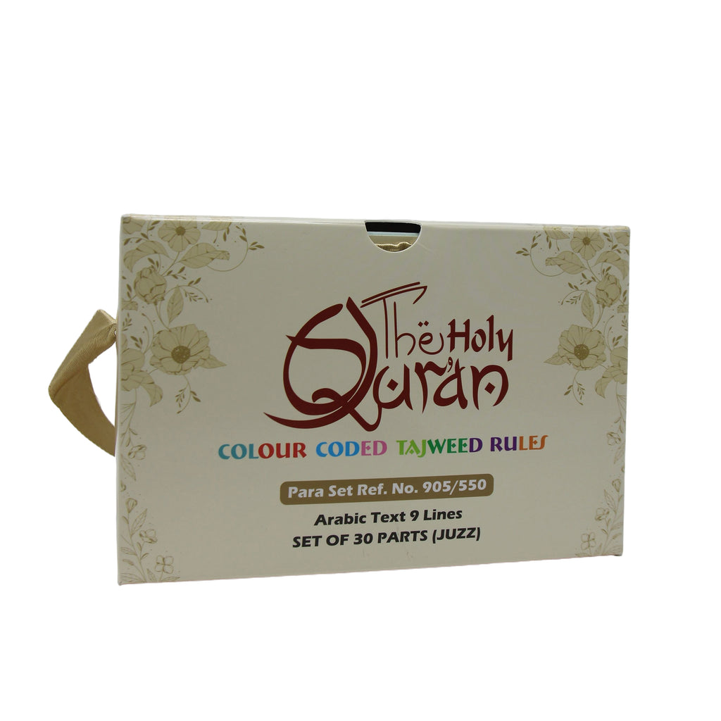 The 30 Parts Indo Pak Holy Quran 905/550 is a beautifully presented Quran set designed for convenient recitation and study. This edition comes in 30 individual Juz (parts), allowing readers to easily divide their recitation and complete the Quran at a comfortable pace. The set is neatly arranged in a protective storage box with a carry handle, making it practical for home, mosque, or madrasa use. Printed in the traditional Indo Pak script, this Quran is widely preferred for its clear and familiar style, especially for readers who learned Quran recitation using the Indo Pak format. The text also features colour-coded Tajweed rules, helping readers recognise and apply proper pronunciation while reciting the Quran. With its compact A6 size, each part is lightweight and easy to hold, making it suitable for daily reading, Quran circles, and group recitation. The boxed set keeps all 30 parts organised and protected, making it convenient to carry or store. This Quran set is ideal for Ramadan recitation, madrasa study, and family use, and also makes a thoughtful Islamic gift for special occasions. Key Features