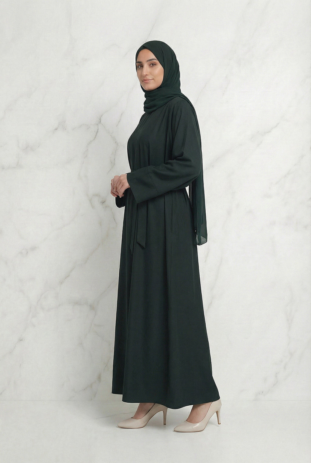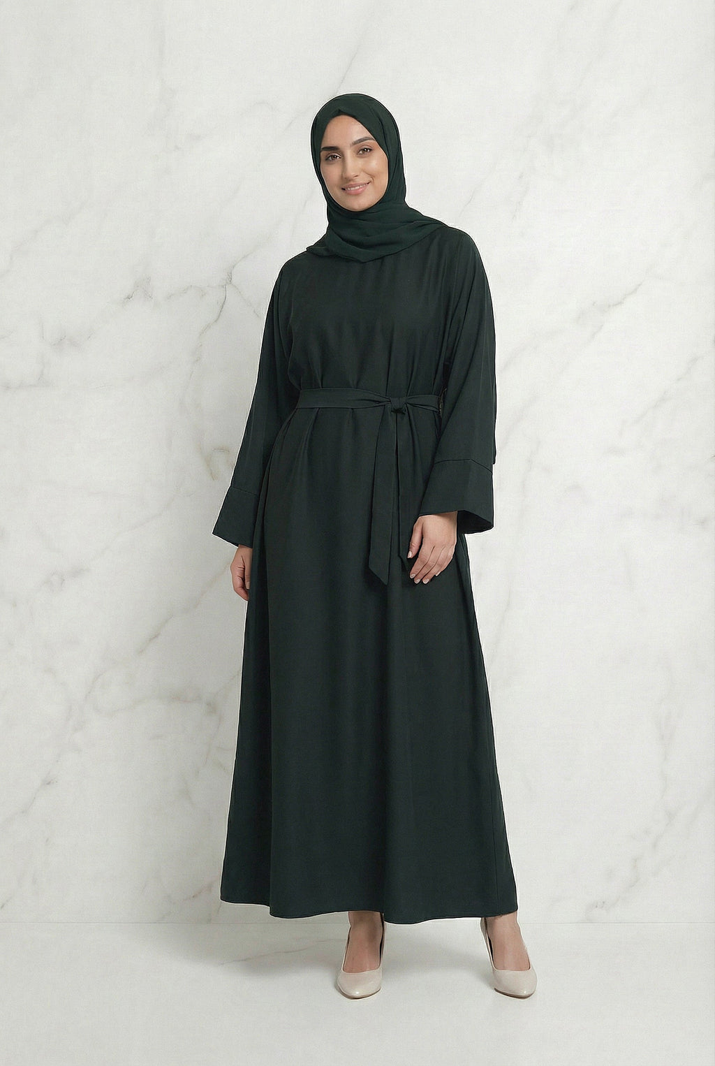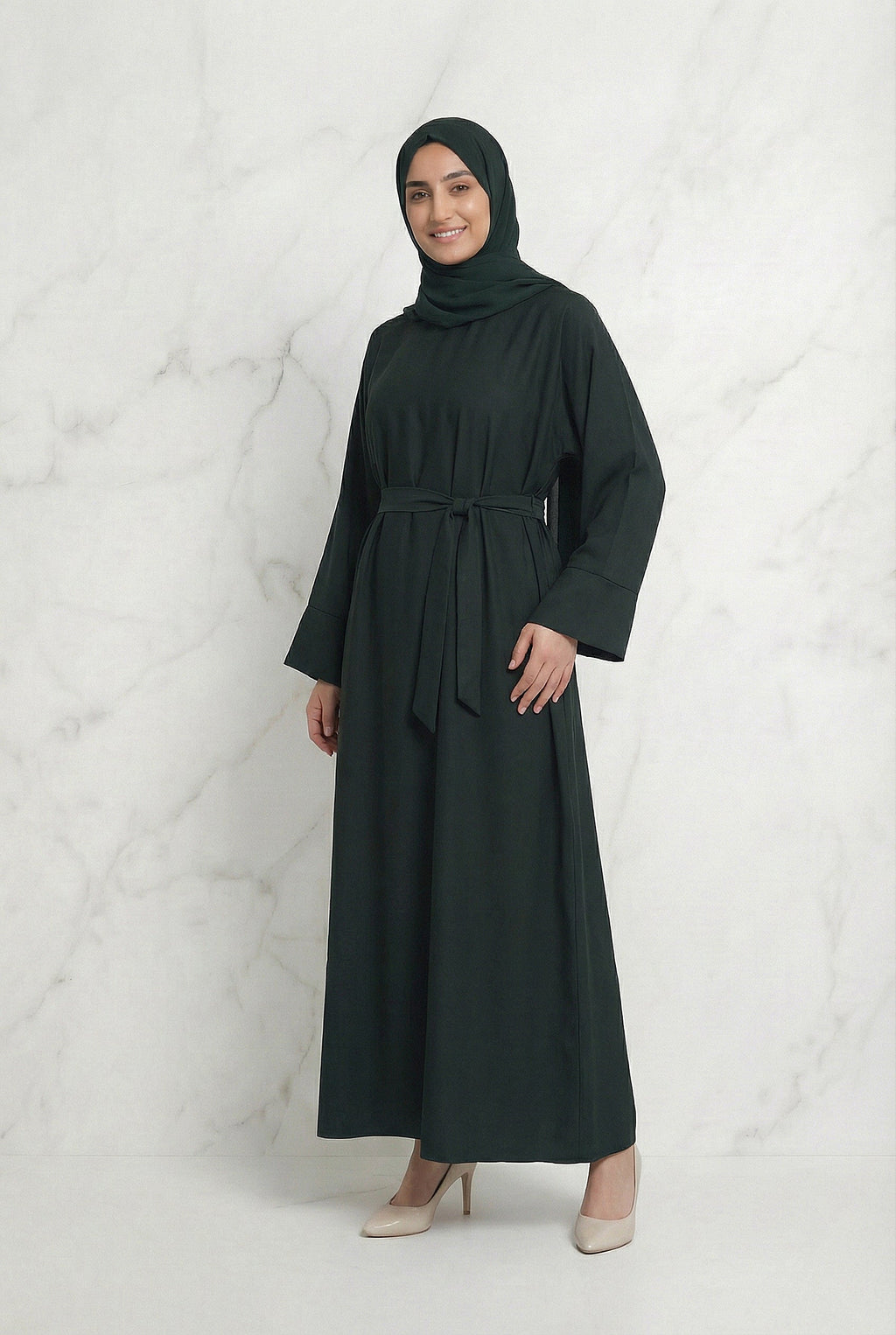 The Belted Abaya in Dark Green is a graceful and refined design created for effortless modest styling.