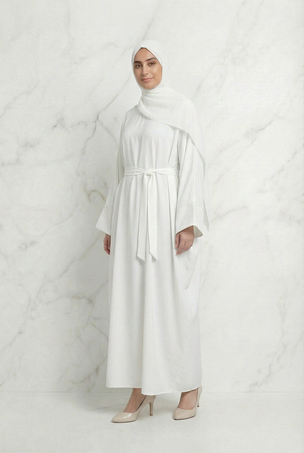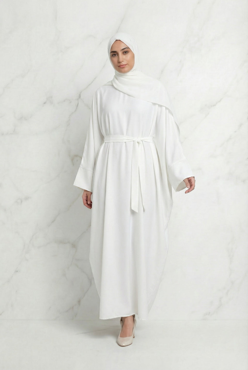 The Belted Abaya in Off White is a graceful and refined design created for effortless modest styling.
