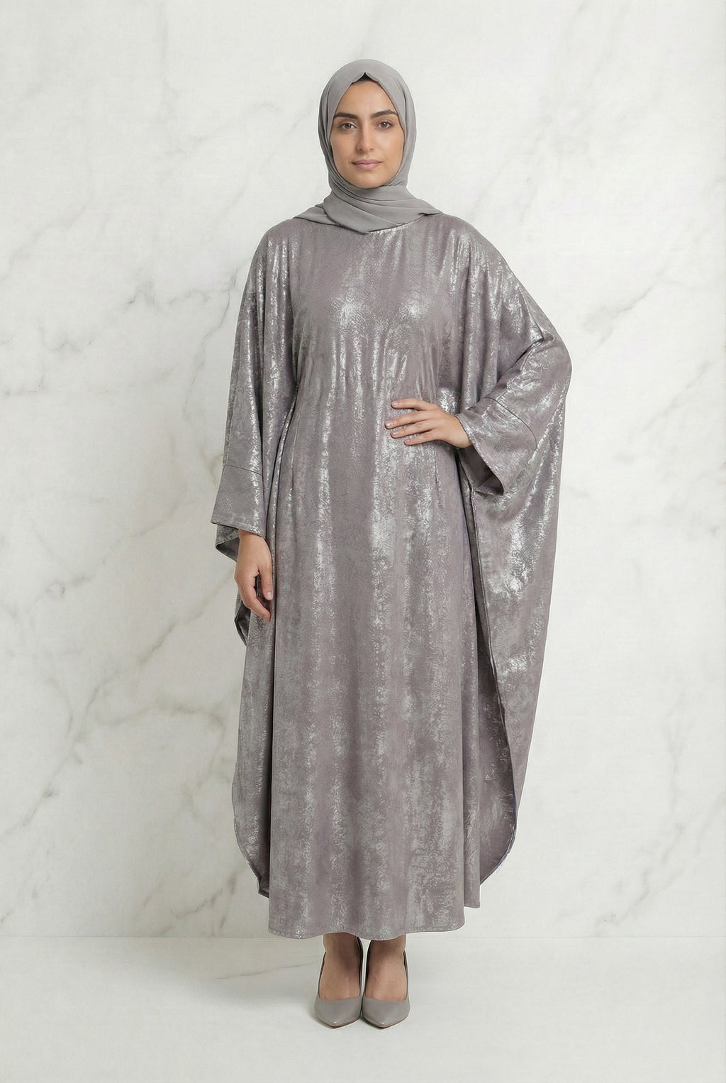 The Velvet Abaya in Silver Grey is a statement piece designed for elevated modest styling.