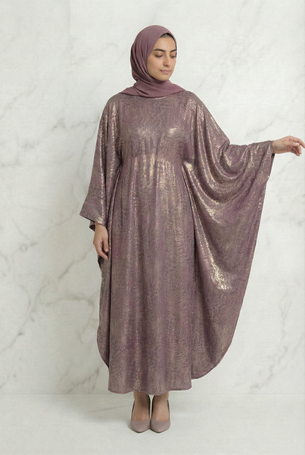 The ASL 645 Abaya in Mauve Shimmer is a statement piece designed for women who appreciate